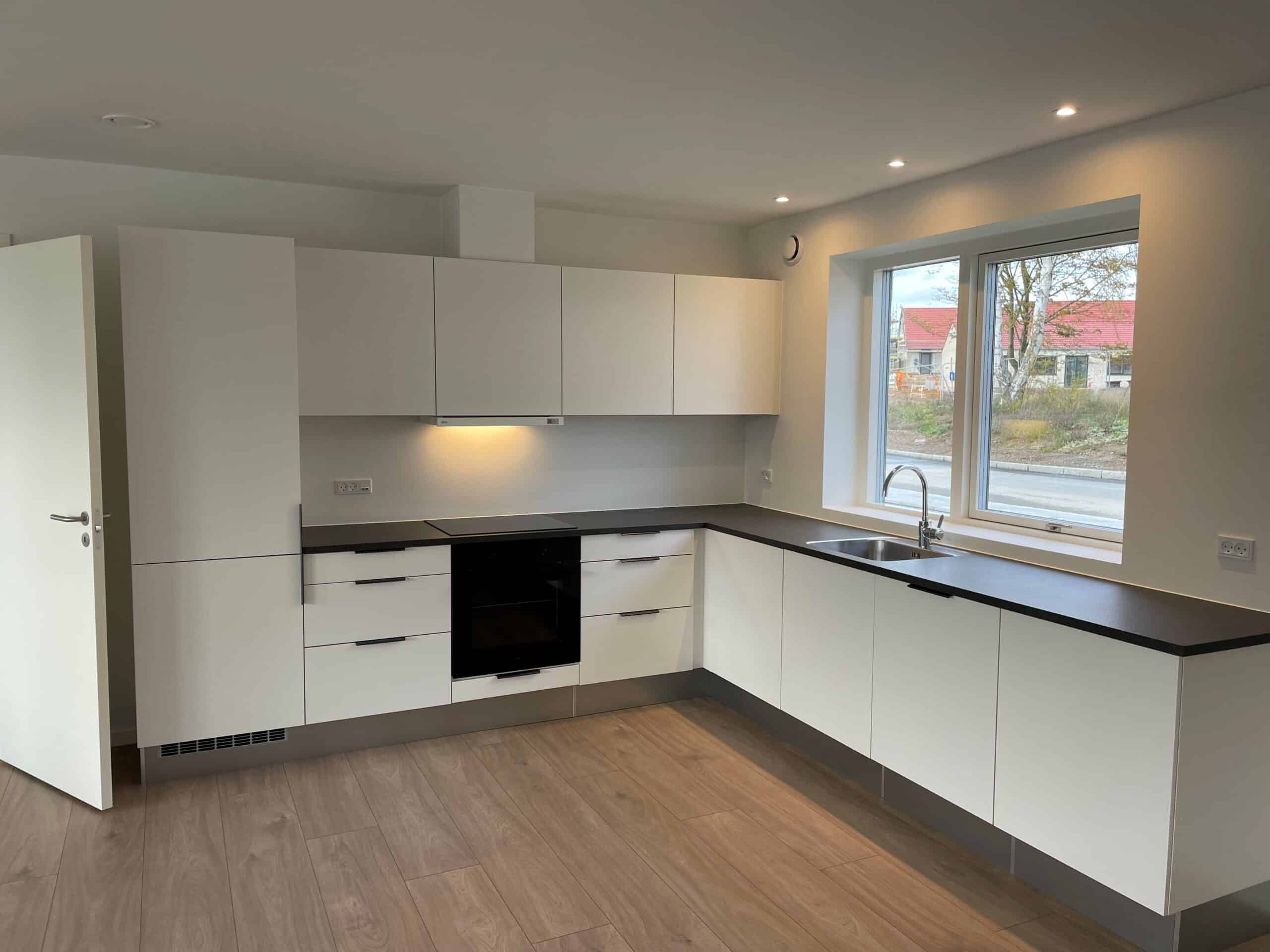 Boligerne er opført med hvidt inventar fra HTH, moderne grå klinker og laminatgulve i træ. I køkkenet medfølger alt i hårde hvidevarer. I entréen er der forberedt til vaskesøjle – vaskemaskine og tørretumbler medfølger ikke.